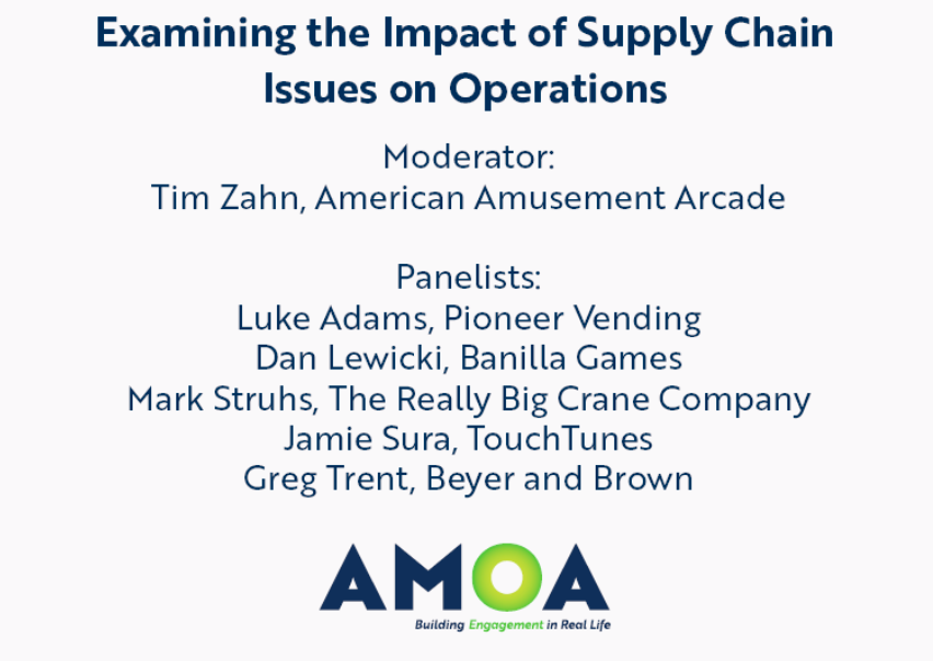 The digital event will be moderated by Tim Zahn of American Amusement Arcade. Panelists will include Luke Adams (Pioneer Vending), Dan Lewicki (Banilla Games), Mark Struhs (The Really Big Crane Company), Jamie Sura (TouchTunes) and Greg Trent (Beyer and Brown).
