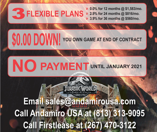 If you planned on financing a Jurassic World: Fallen Kingdom unit for your arcade, now is the time to do it! Along with Fristlease, Andamiro has been offering three flexible plans to finance the game, and the deadline to sign is now Oct. 31.