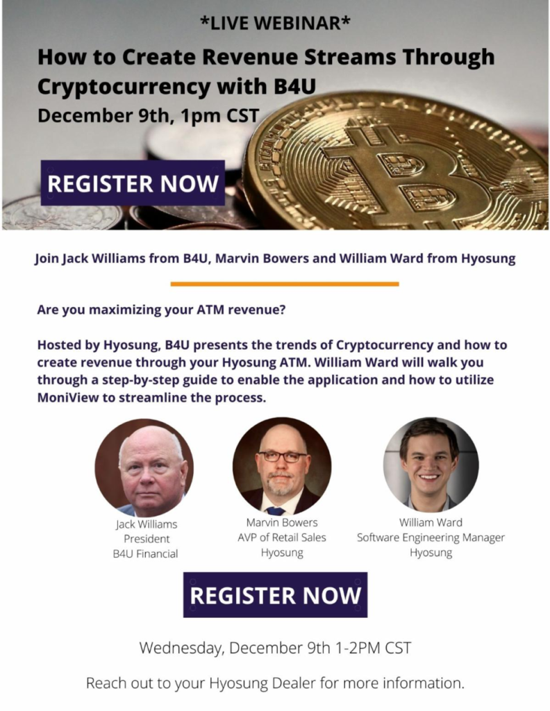 Click here to sign up for a webinar from Hyosung and B4U Financial that presents the trends of cryptocurrency and will discuss how to create revenue. The online event will be held Dec. 9 from 1-2 p.m. Central time.