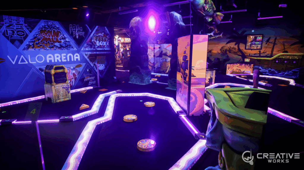 Creative Works has completed its install of a 7-hole pirate-themed blacklight mini-golf course and a ValoArena mixed reality attraction at Airway Fun Center in Portage, Michigan.