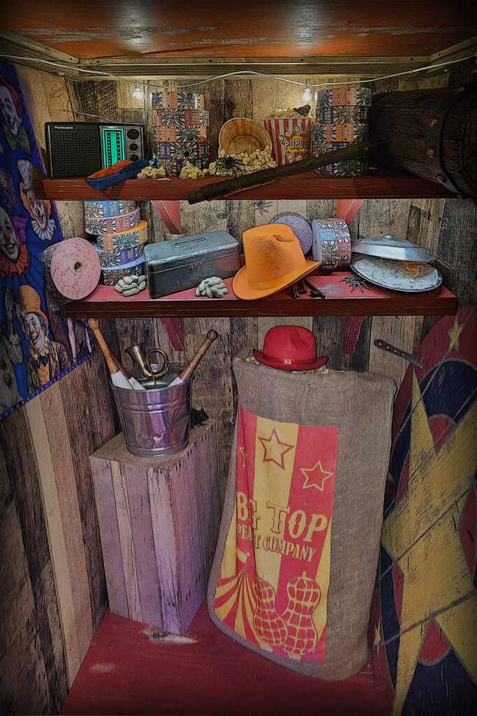 Clown Around features a circus theme where 1-3 players step inside, close the door and watch it “lock” behind them. (The magnetic locks allow users to leave at any time by pressing the End Game button.)