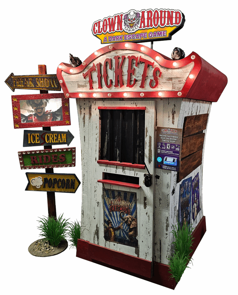 Clown Around features a circus theme where 1-3 players step inside, close the door and watch it “lock” behind them. (The magnetic locks allow users to leave at any time by pressing the End Game button.)