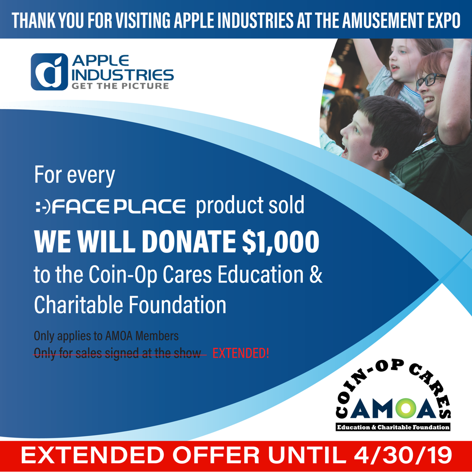 Apple Industries is extending its donation offer to April 30. For every Face Place product sold, the company will give $1,000 to AMOA’s Coin-Op Cares Education & Charitable Foundation. The offer applies to purchases made by AMOA members only. Visit www.faceplacephoto.com or reach out directly at [email protected] for details.