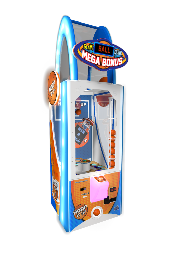 The game will be offered in two different versions: a full ticket redemption unit and a unique ball merchandiser / ticket redemption unit that will allow players that hit the mega bonus to receive a ball or tickets. On both versions, if the player misses the hoop and/or the bonus, they still win tickets depending on where the ball lands on the rotating playfield.
