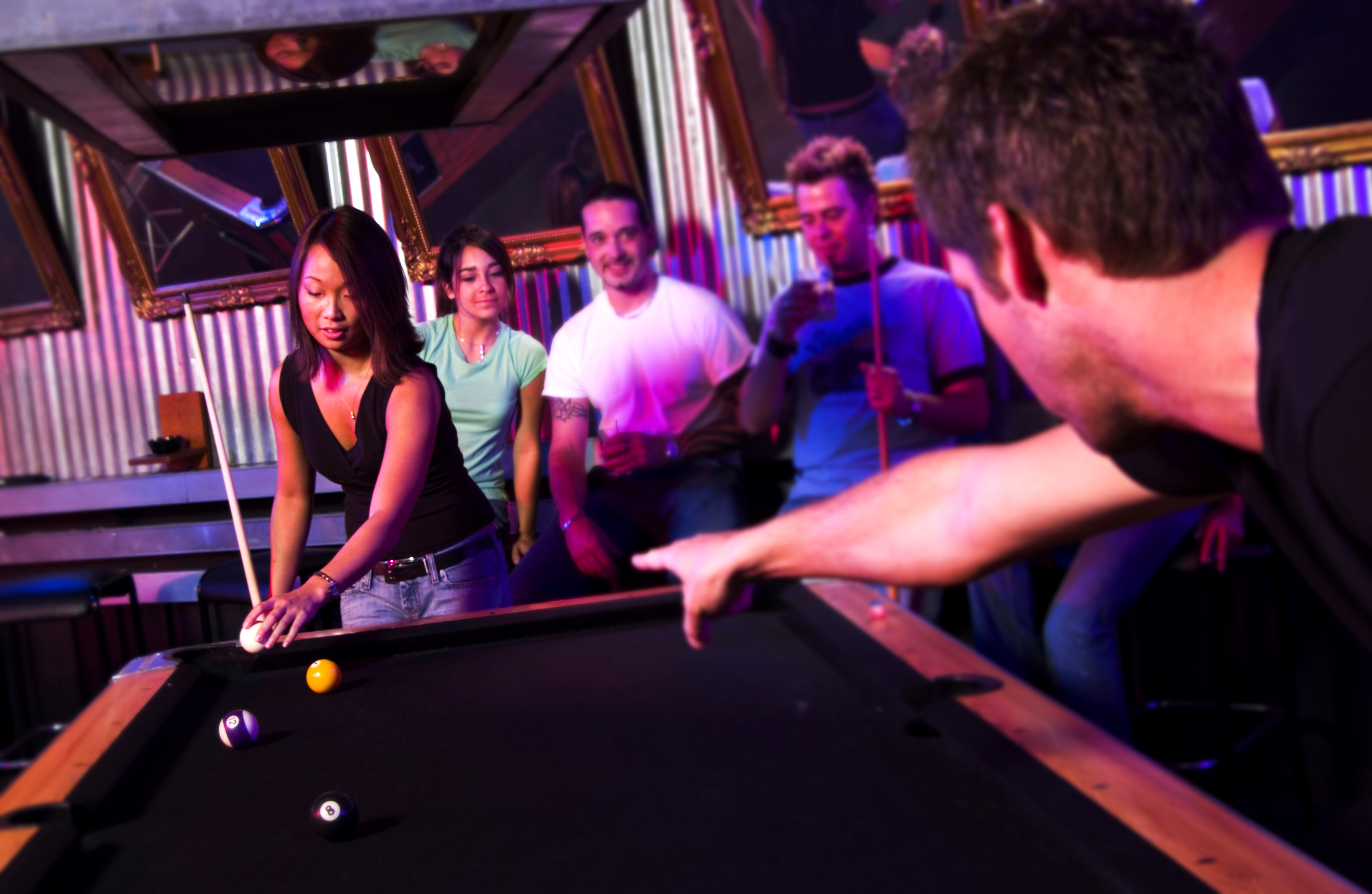 Britt Beard Chad Duke Brock Meyer Alissa Childs Chandra Avina horizontal young adult nightclub playing pool lifestyle man men male woman women female people oriental asian japanese chinese mexican hispanic latino minority minorities ethnic ethnicity racial diversity white caucasian 20 20s twenty twenties years bar pub club night tavern downtown city urban life spend night nightlife party parties partying socializing date dating courting courtship boyfriend girlfriend friend friendship fun leisure recreation activity activities entertainment billiard games strategic sport VStock