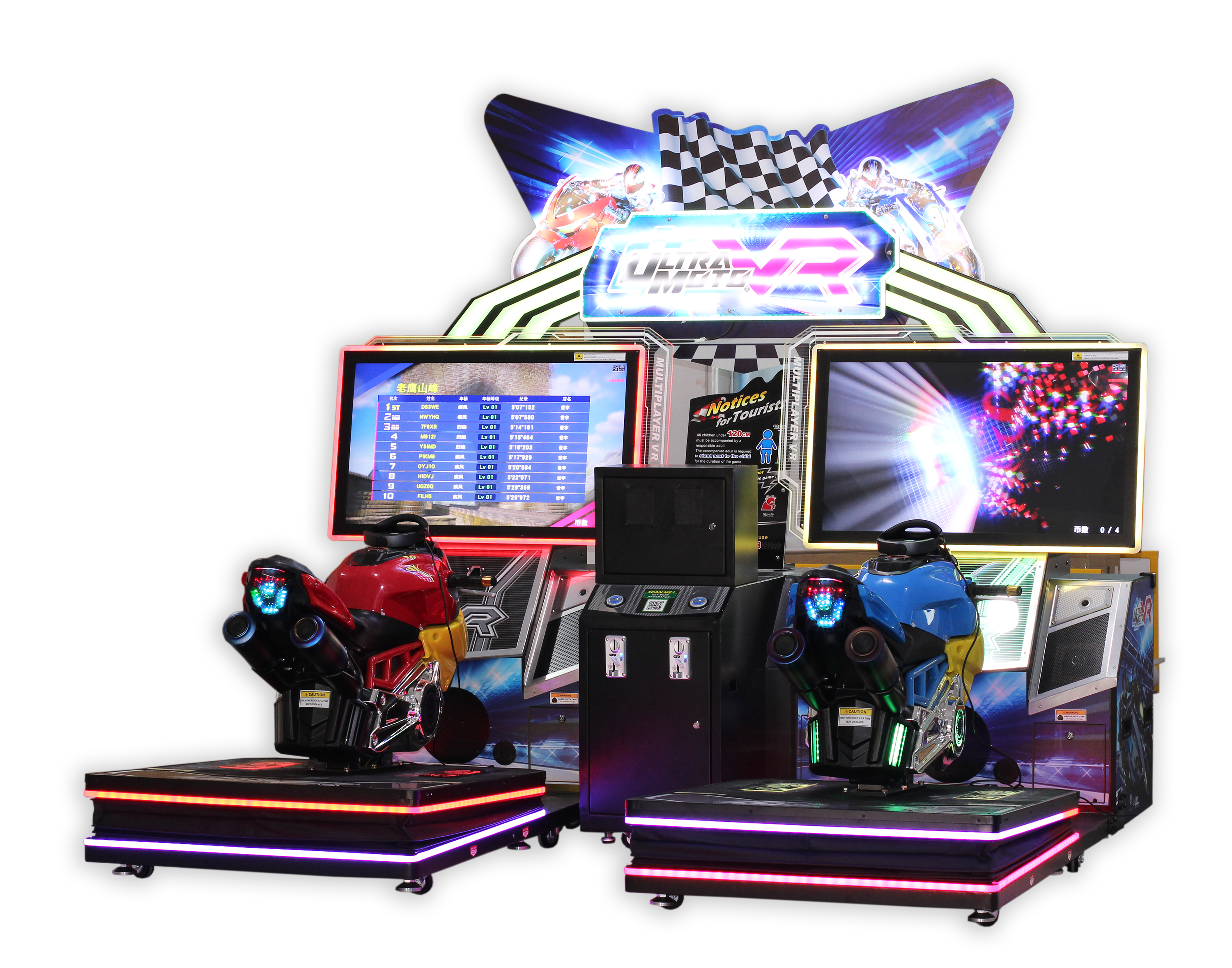 Developed in collaboration with IGS, Ultra Moto VR integrates VR technology, bass vibration, wind effect and motion. It’s sold as a twin set for head-to-head racing, and is linkable up to four units (eight total bikes).