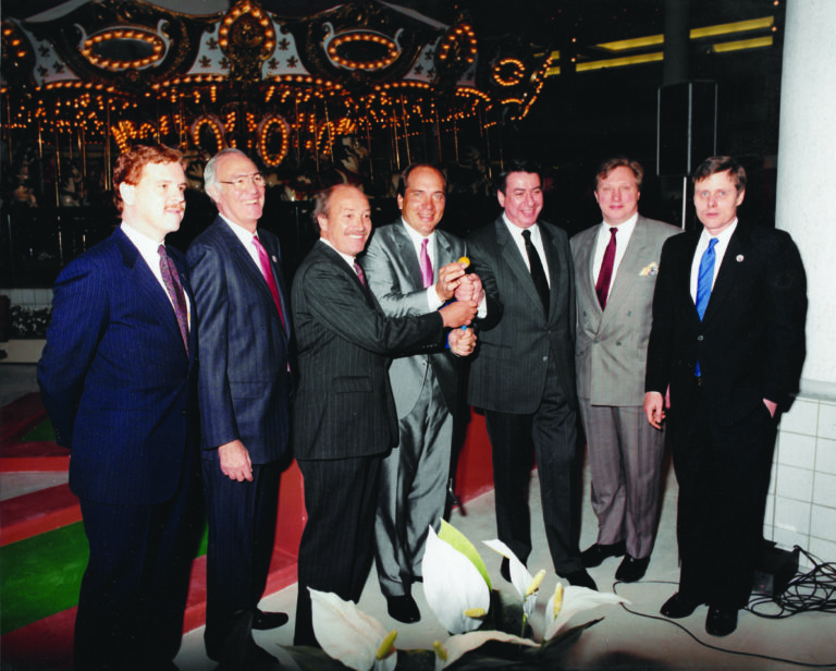 In my father’s earlier years – At the ribbon-cutting ceremony for Time-Out on the Court in Cincinnati, Ohio (March 1989) are from left, my father George McAuliffe, Time-Out Founder Tico Bonomo, Time-Out President Arnold Kamin­kow, Hall of Fame Cincinnati Reds catcher Johnny Bench, SEGA USA President David Rosen, an unknown mall developer, and Time-Out COO John Denlinger.