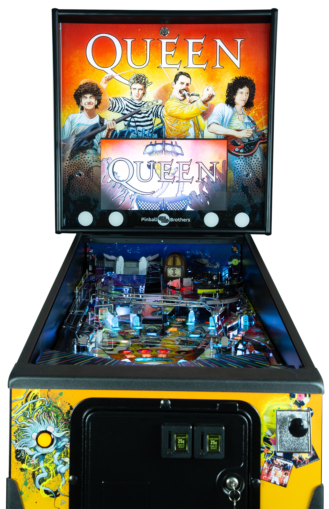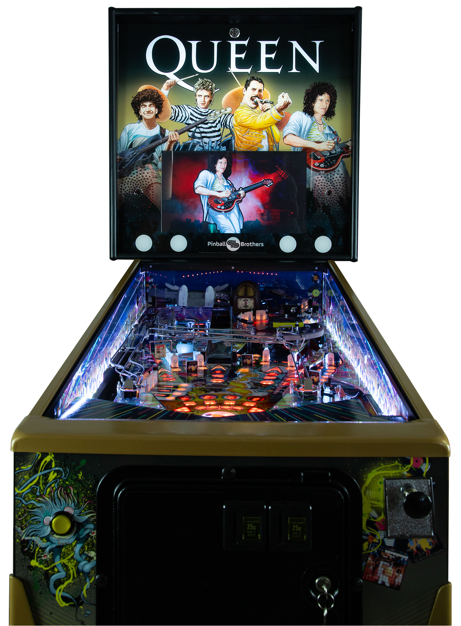Brian May’s legendary Red Special guitar in the shape of an upper playfield where players can lock balls to start the Red Special multi-ball. They can also “visit” the epic Wembley Stadium to lock balls to start yet another of the game’s many multi-balls. Players should also keep an eye on the radio, the factory says, advising that it can help them time their flips and also say, “Collect autographs, instruments, band members, tour passes and posters on your way to eventually reaching the final wizard mode ‘I Want it All.’” Queen – Live in Concert has an RGB light show and a high-fidelity sound system which includes an 8” bass speaker.