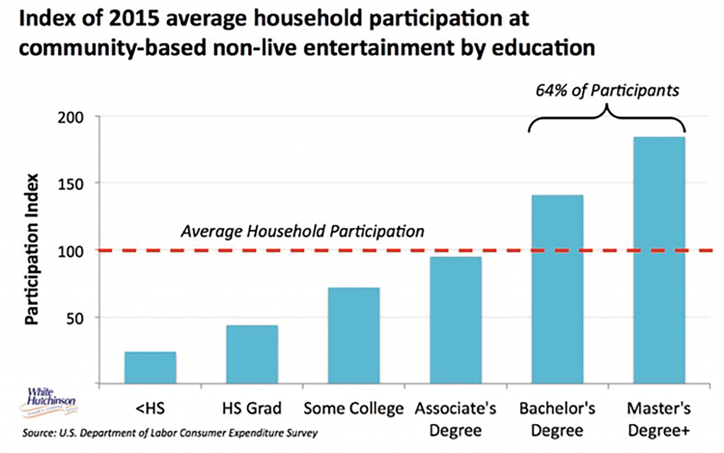In addition, this new business model addresses consumers’ desire for new and unique experiences, those that are shareworthy on social media to gain social capital. The new business model targets adults, not families. And it targets higher socioeconomic households instead of the shrinking-and-discretionary-expenditure-challenged middle class the older models catered to. Bachelor’s Degree and higher educated households now account for almost two-thirds of all participation at community entertainment venues.