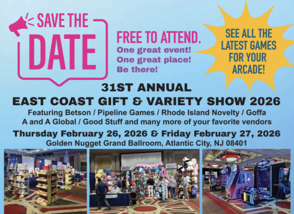 The 31st Annual East Coast Gift & Variety Show in Atlantic City is set for Feb. 26-27, the New Jersey Attractions Association reported. The event will be at the Golden Nugget Grand Ballroom and feature Betson, Pipeline Games, Rhode Island Novelty, A&A Global and many more vendors.