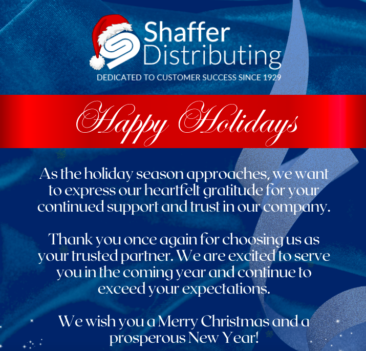 “We are excited to serve you in the coming year and continue to exceed your expectations. We wish you a Merry Christmas and a prosperous New Year!” You can contact Shaffer at www.shafferdistributing.com.