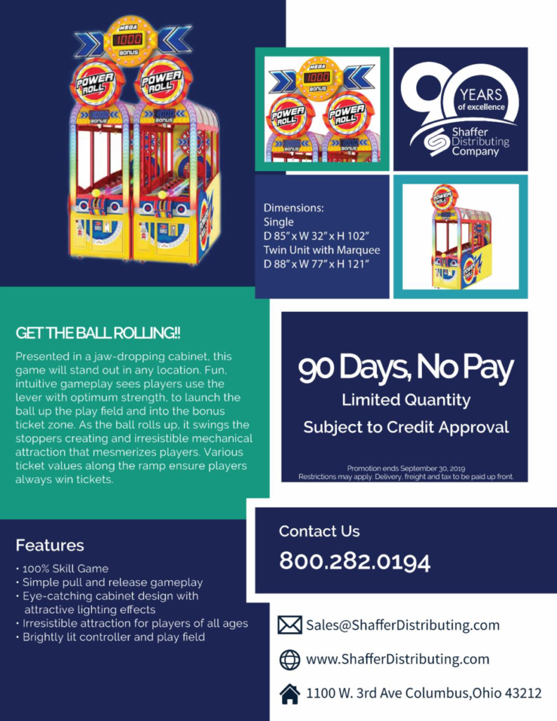 With simple pull and release gameplay, Power Roll features an “eye-catching cabinet design with attractive lighting effects” and Shaffer calls it a game with “irresistible attraction for players of all ages.