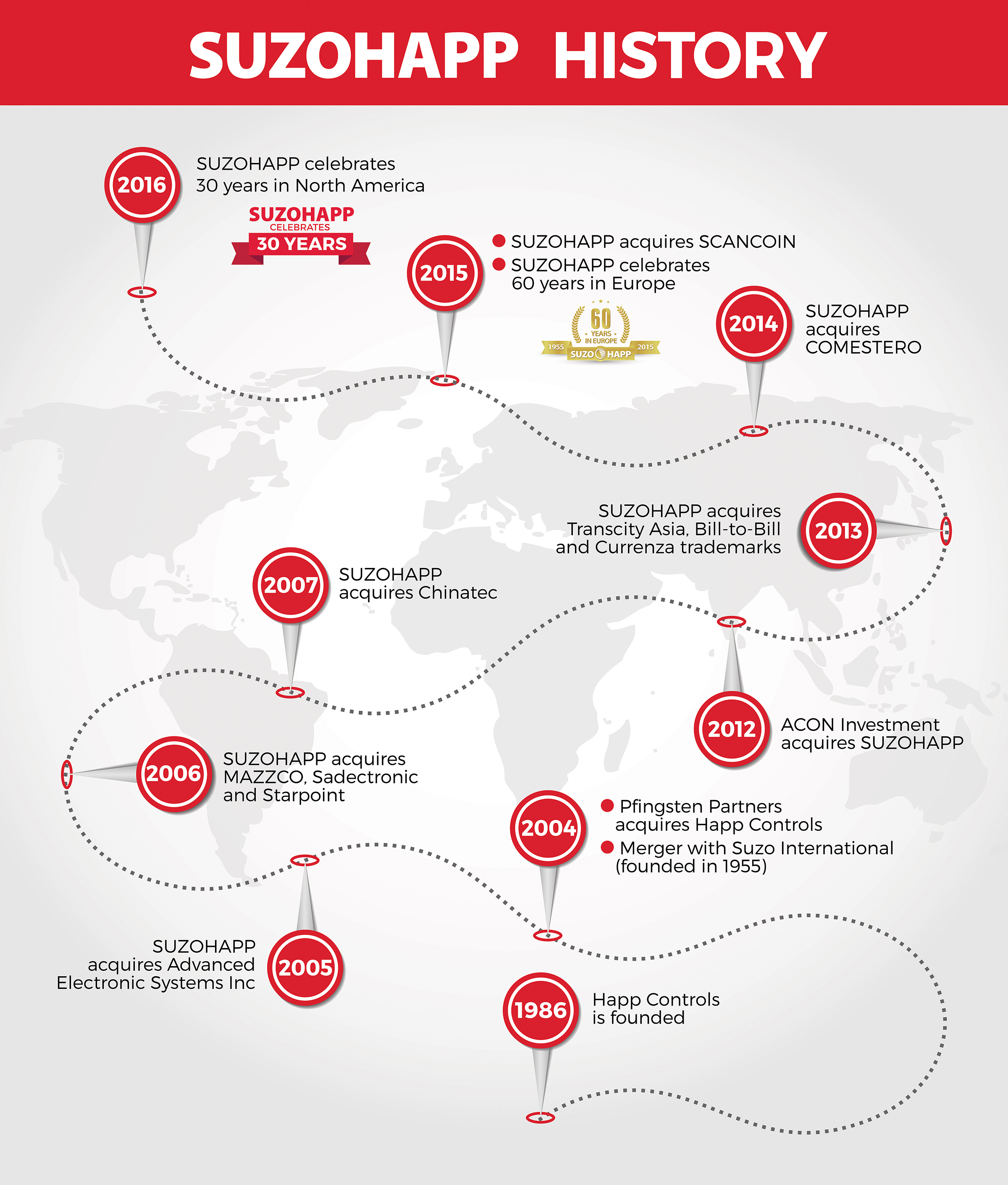 The company first opened its doors in 1986, when Frank Happ formed Happ Controls, Inc. in Buffalo Grove, Ill. After 18 years providing service and support to customers’ businesses in the growing amusement market, it was bought in 2004 by Pfingsten Partners, a Chicago-based company. They combined it with Suzo International (founded in 1955) to become SUZOHAPP, and were lauded as the largest gaming and amusement parts and components supplier in the world.