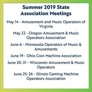 The AMOA of Virginia will hold their next meeting May 14; Oregon’s Amusement & Music Operators Assn. on May 22; the Minnesota Operators of Music & Amusements on June 6; the Ohio Coin Machine Assn. on June 19; Wisconsin’s runs from June 20-21; and the Illinois Gaming Machine Operators from June 25-26.