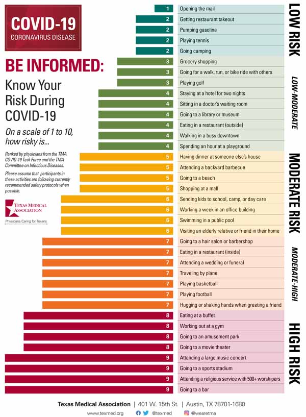 In unwelcome news for operators, the COVID-19 Task Force and Committee on Infectious Diseases at the Texas Medical Assn. have put together a chart that ranks activities on their risk level for possibly transmitting the virus. In it, going to a bar ranks among the highest at a 9.
