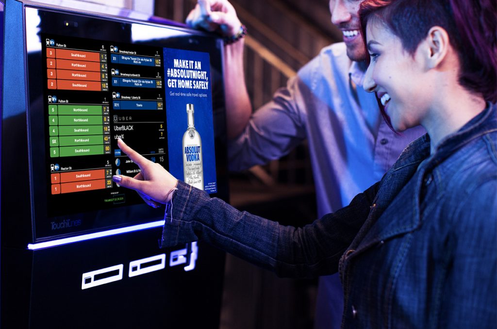 Absolut Vodka, Malibu and Jamesons (all popular liquor brands of Pernod Ricard USA) have teamed up with TouchTunes to sponsor the first integrated, local transit information program which will be displayed on TT jukes in bars and taverns nationwide. TouchTunes, which says it reaches over 38 million Millennial viewers/listeners monthly, believes this is a big step in combating drinking and driving and will spread awareness about safe and responsible consumption.